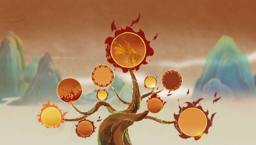 老十:(混响)我们金乌,是上古天帝帝俊与女神羲和的儿子,是光和热的化身,地上的凡人们把我们称作太阳。但河川、草木、生灵,都无法承受我们兄弟十人的巨大热量,干涸枯亡。凡人因此求告天帝,天帝命射手后羿下凡,令他只留下最出色的一位金乌。后羿射落了六位兄长,而长兄也以光芒灼伤 了他的双目,我们得以喘息,后羿不会善罢甘休。我们4个,也面临着生与死的考验。