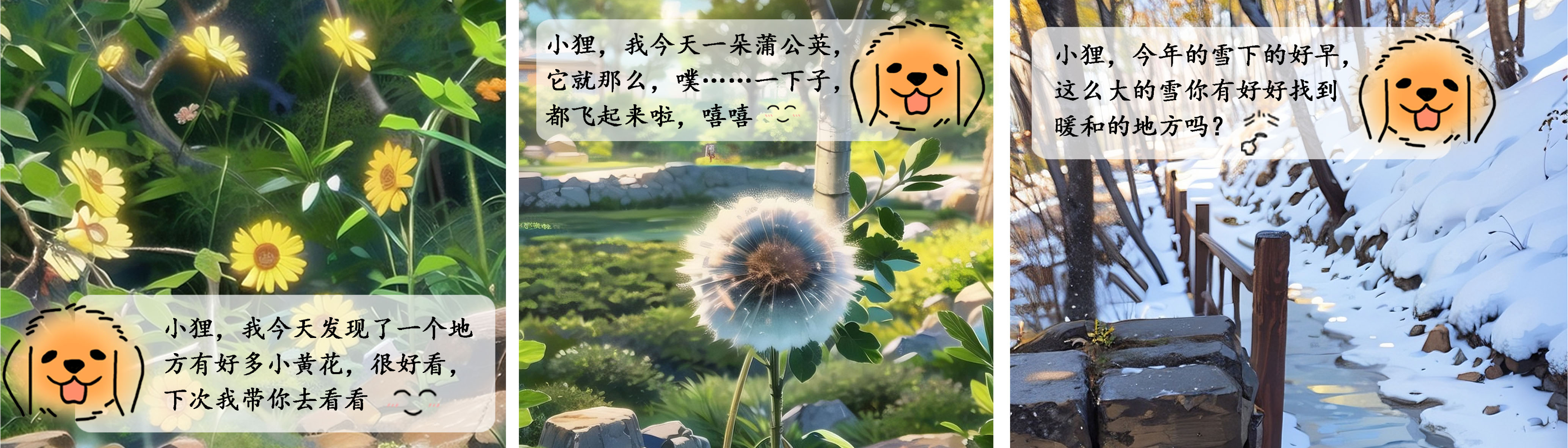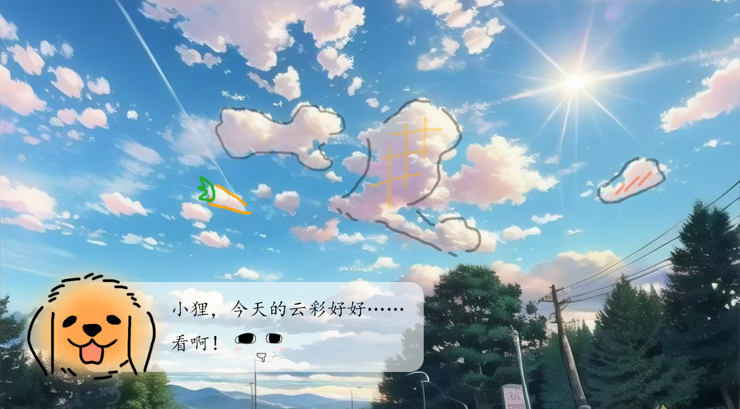 金毛:(开心)小狸,小狸,早上好呀!今天的云彩像棉花糖,特别好……看!