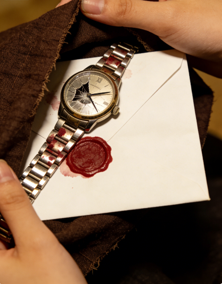 包裹里有一封信,和一只男士腕表。表盘已经碎裂,表链上沾着暗红色的污渍