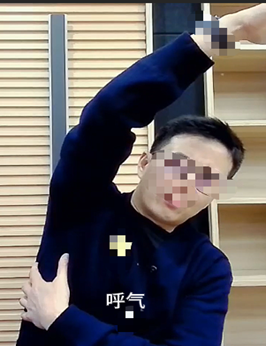 伸起右手,把左手放在自己的右肋骨上,伸拉然后做吸气,膨胀右肋骨,然后四次吸气呼气,把那个肋骨胀起来,像闻花一样把气吸进去,两个八拍。
