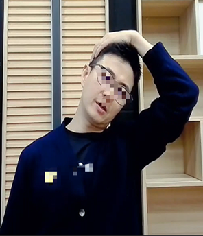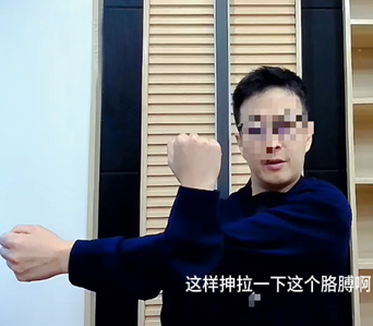 头往右歪,右手放头部左侧,慢慢下压,帮助头部往右歪,掰一掰,这个肩膀往下,一个八拍。