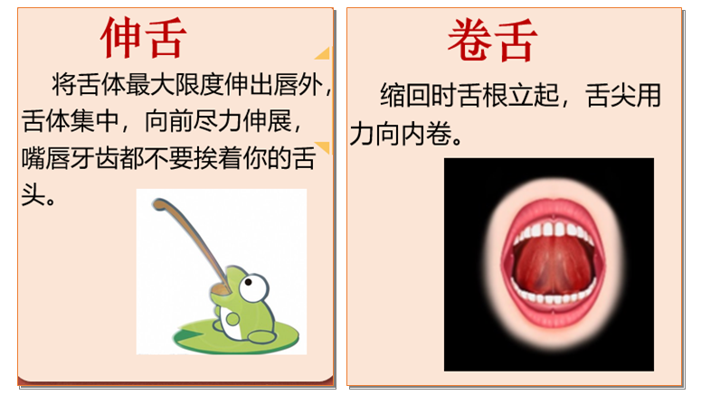 (1)伸卷舌:将舌体最大限度伸出唇外,舌体集中,向前尽力伸展,嘴唇牙齿都不要挨着你的舌头。缩回时舌根立起,舌尖用力向内卷。