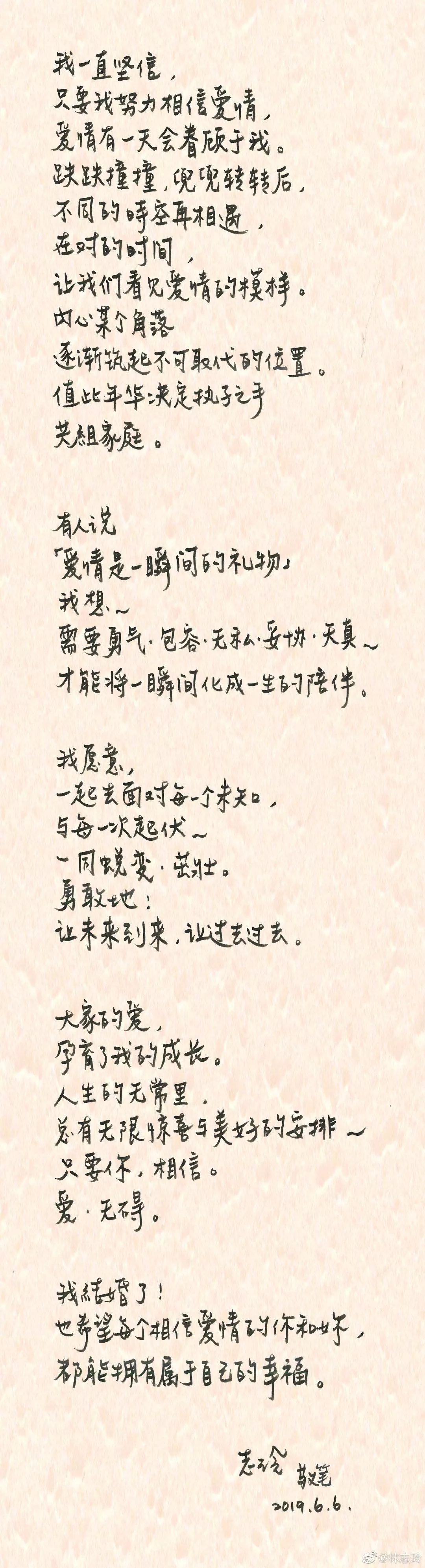 1. 六月才刚刚开始,就有好消息不断传来。一直以来被广大群众催婚的林志玲,终于结婚了。找了半辈子爱情的她,终于还是被爱情眷顾了。然而,对象却不是言承旭。但是看着林志玲在微博上发表的幸福宣言,让人笃定那句话,婚姻是水到渠成的爱情。林志玲和言承旭的爱情,可以说是很多人的意难平。