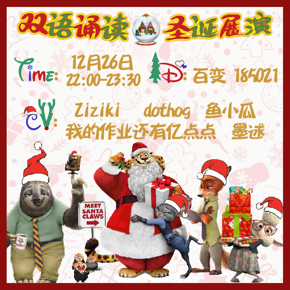 Disclaimer:This play is adapted from the movie Zootopia.Copyrights belong to The Walt Disney Company. Do not reproduce it to anywhere without my permission.本剧本改编自电影《疯狂动物城》,版权归迪士尼所有; 未经许可,禁止转载