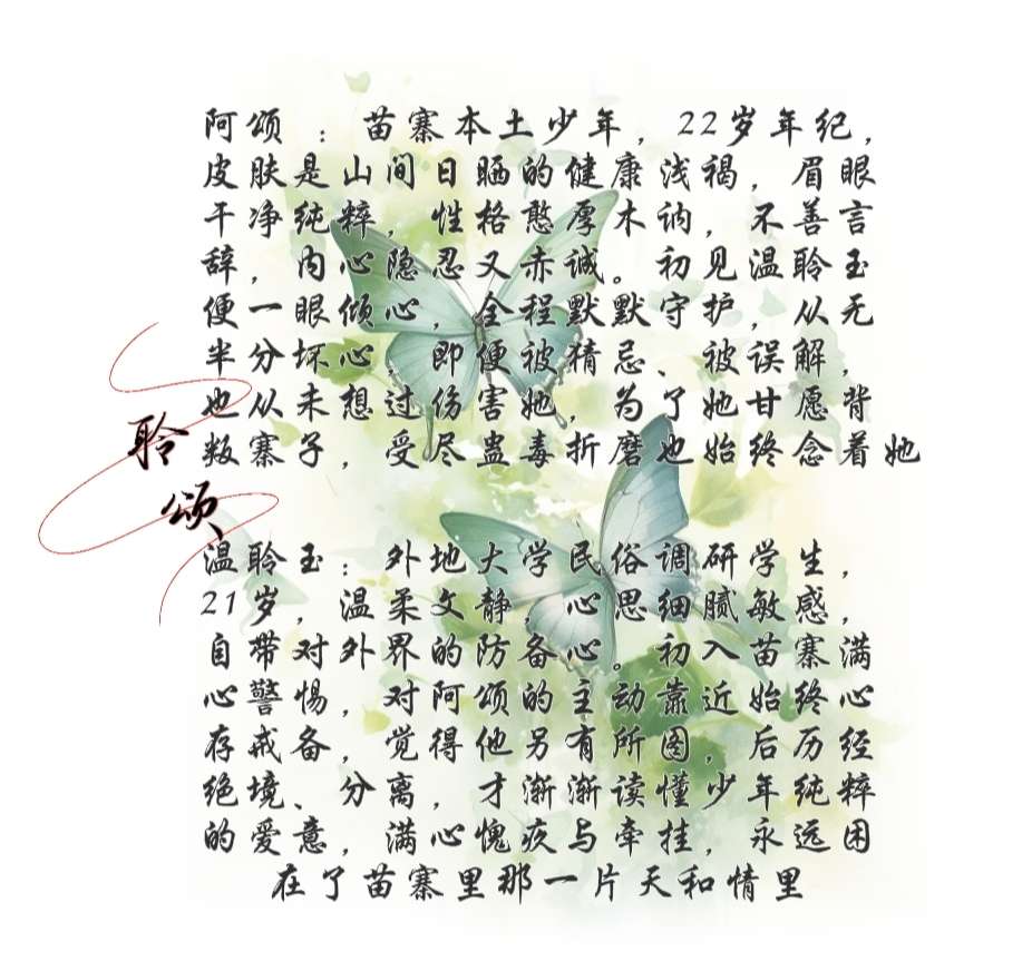 民俗调研学生温聆玉初入苗寨,误认少年阿颂别有所图。险境中,阿颂以命相护,为让她自由背叛寨子,受尽蛊毒。温聆玉逃离后满怀愧疚,无法忘怀,终有一日,少年携带满腔爱意,跨越山海找到了温聆玉