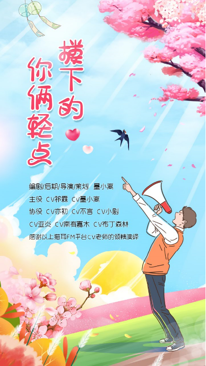 报幕:欢迎收听全一期原创现代纯爱广播剧【楼下的,你俩轻点】,编剧/后期/导演/策划-墨小离,参演CV:祁霖,墨小离,亦初,不言,小剧,亚炎,南有嘉木,布丁森林,感谢以上猫耳FM平台CV老师的倾情演绎。--CV祁霖【觉醒时代工作室】