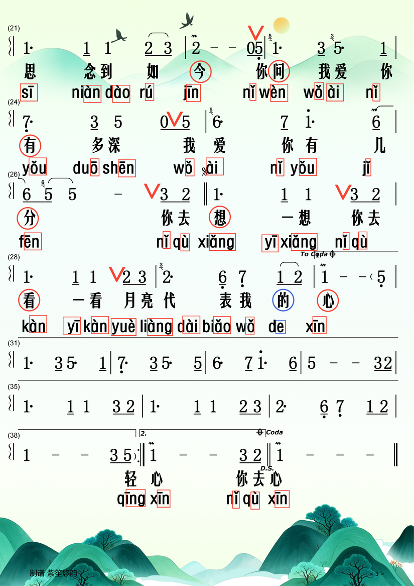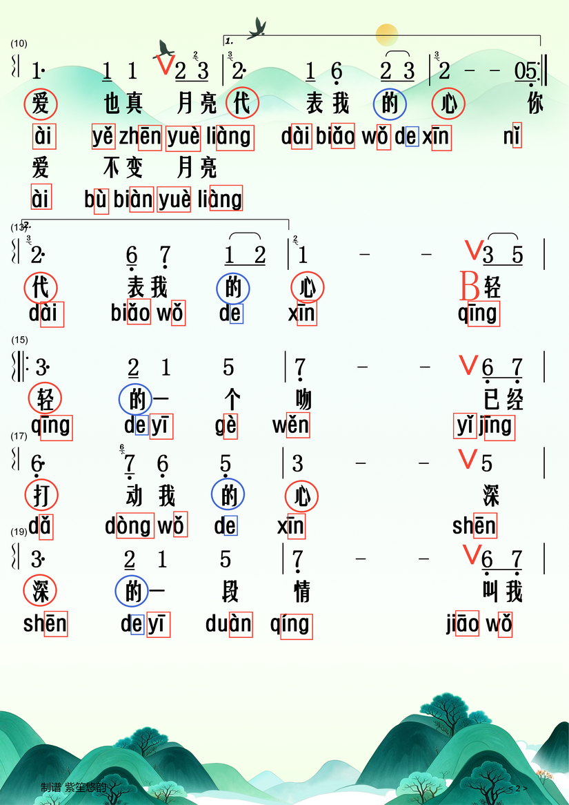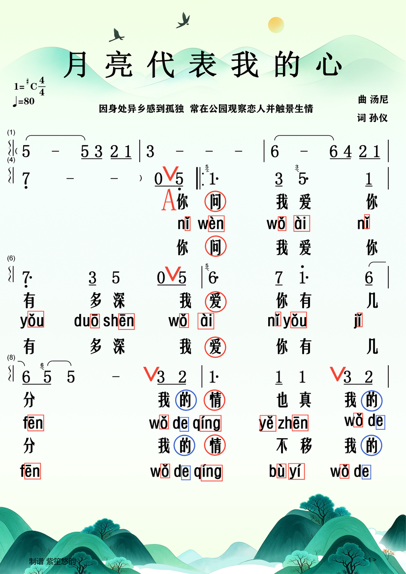 以下是《月亮代表我的心》歌词的拼音标注版本