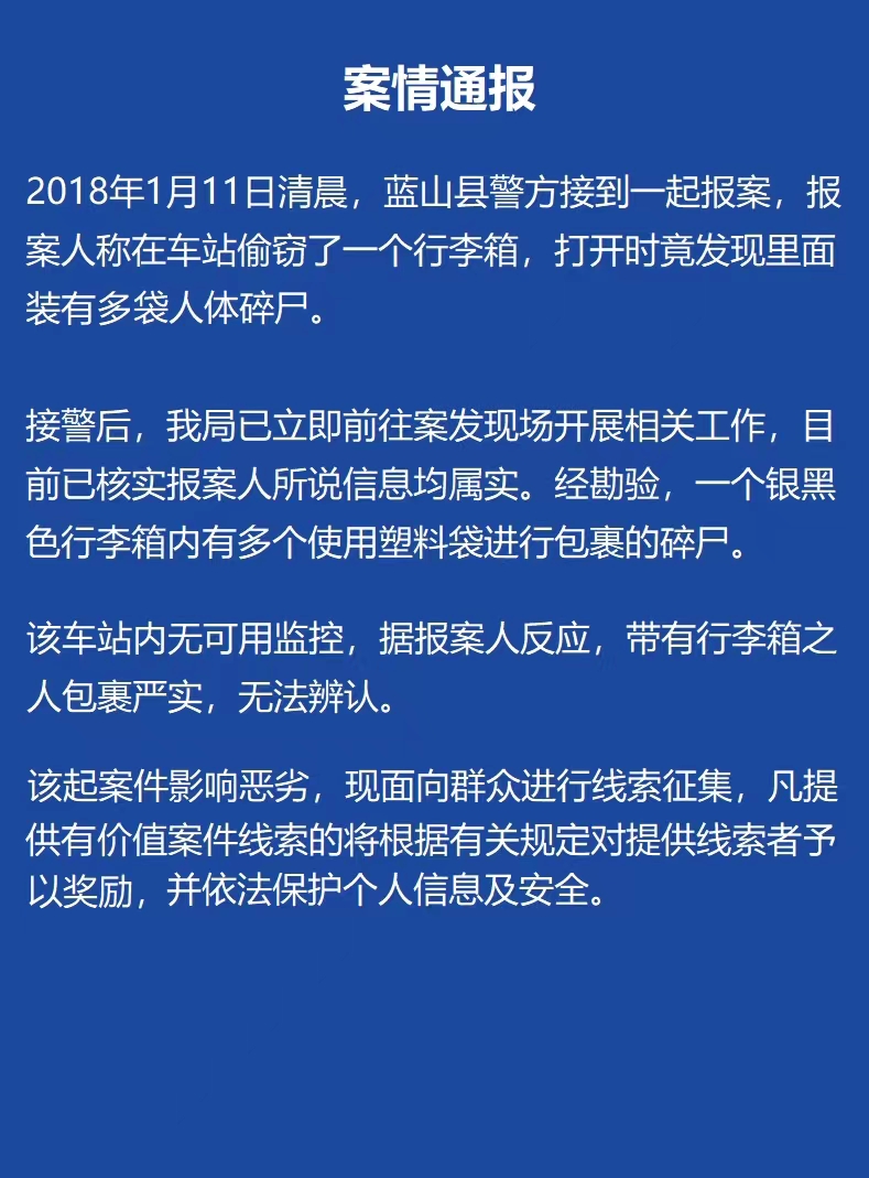 2018年1月11日凌晨蓝山县警方接到一则报案电话,电话那头人竟称自己偷到了一箱碎尸