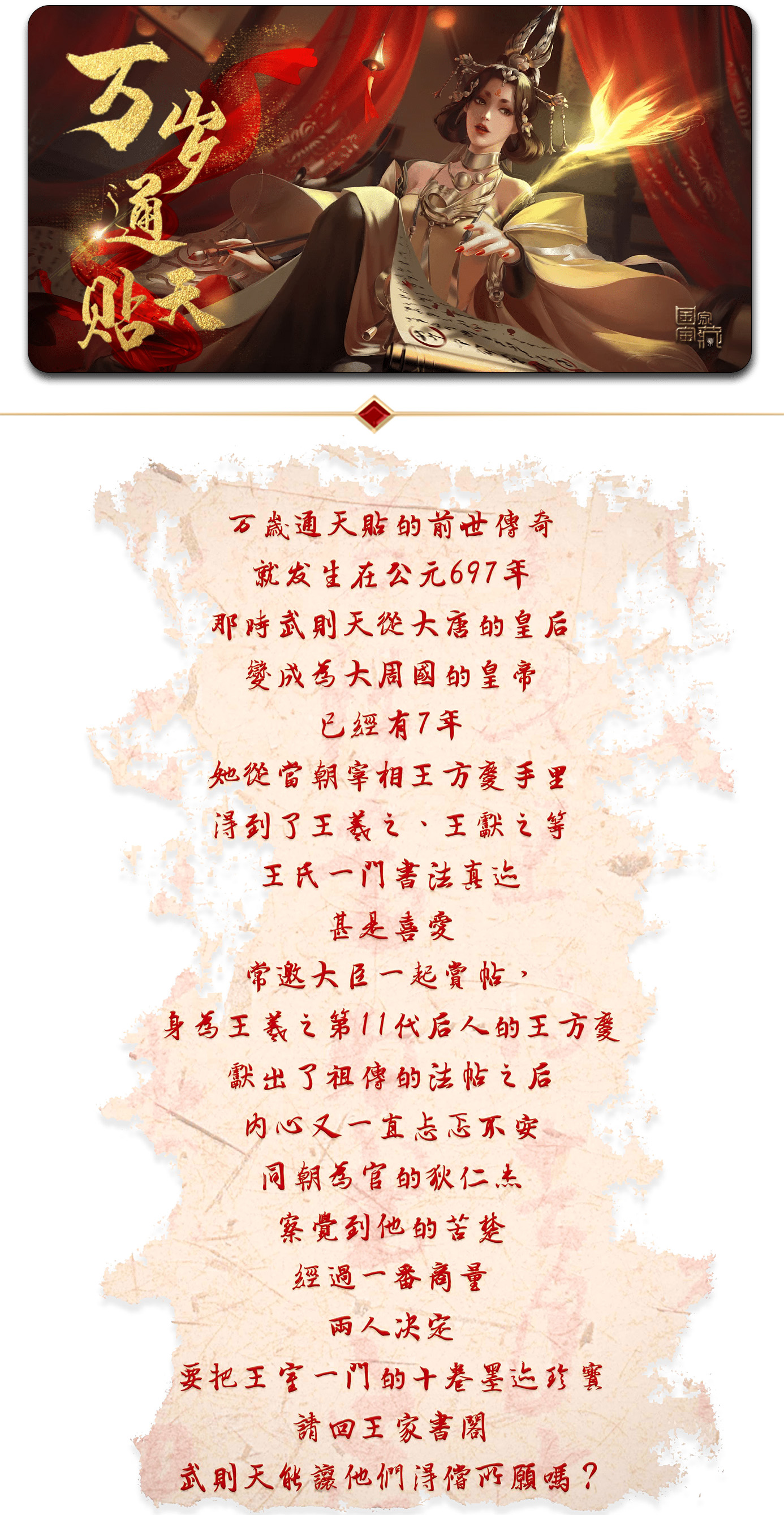 (场景:只见武则天端坐在龙椅前 低头端详着案前展开的法帖)