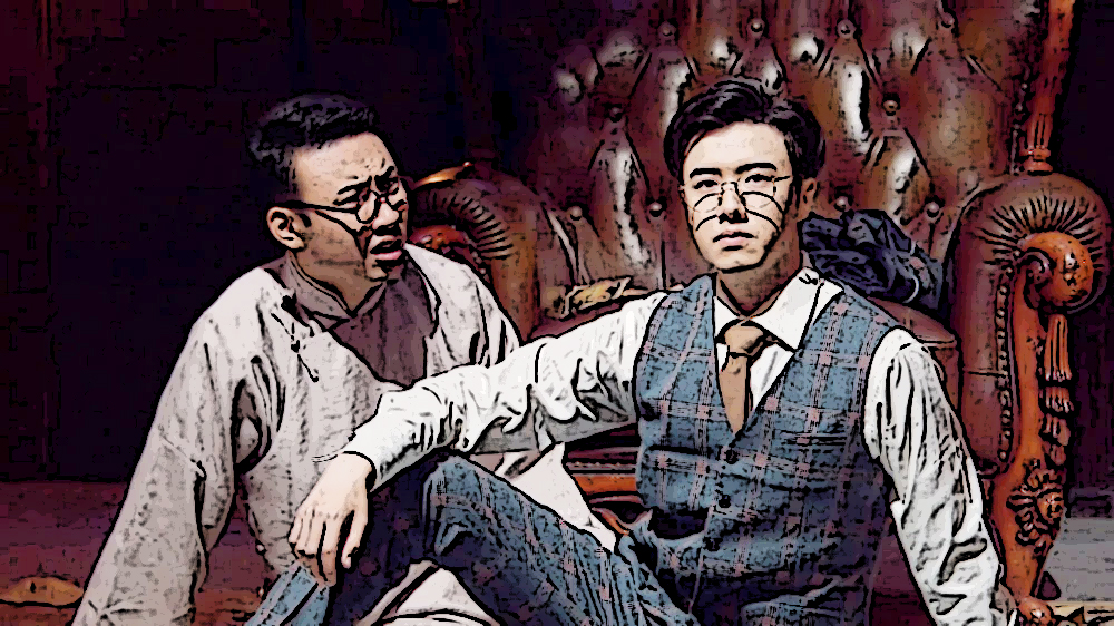 【音乐起。一位不苟言笑的金丝眼镜西装男子坐在欧式豪华单人皮沙发上,优雅地跷着腿,手持一把折扇,随着音乐轻轻打着节拍。旁边站着一长衫男子,戴着黑框圆眼镜,面目隐藏在黑暗中,略略低头,姿态卑微】